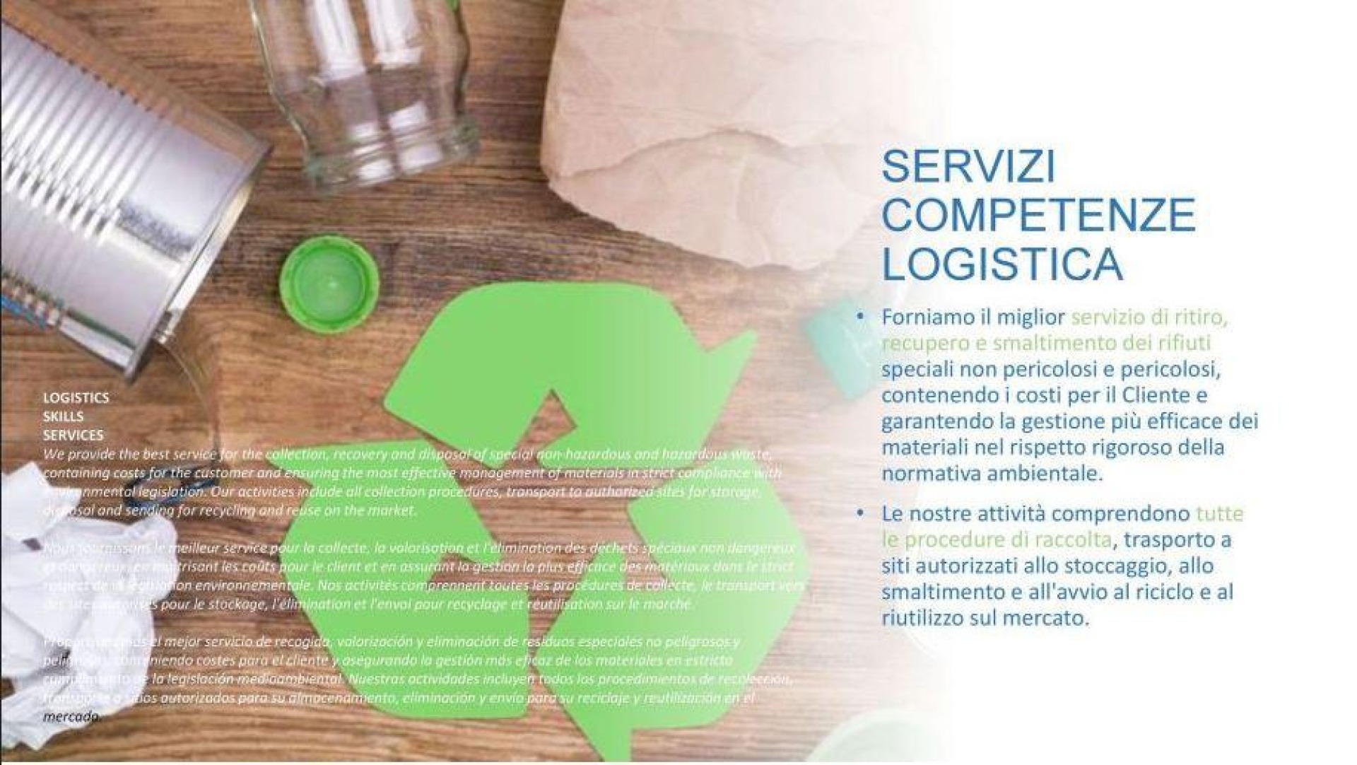 Raccolta Smaltimento Recupero Riciclaggio Rifiuti Vari - Rifiuti Speciali - Rifiuti Speciali Pericolosi - Carta - Cartone e Derivati - Plastica HDPE LDPE ECC. - Macinazione Plastica da RAEE - Vetro - Legno - Pallet - Noleggio Container e Compattatori - Materiali Ferrosi - Rifiuti Industriali - Motori Elettrici - Piccoli e Grandi Elettrodomestici - Apparecchiature Elettriche - Computer - Stampant