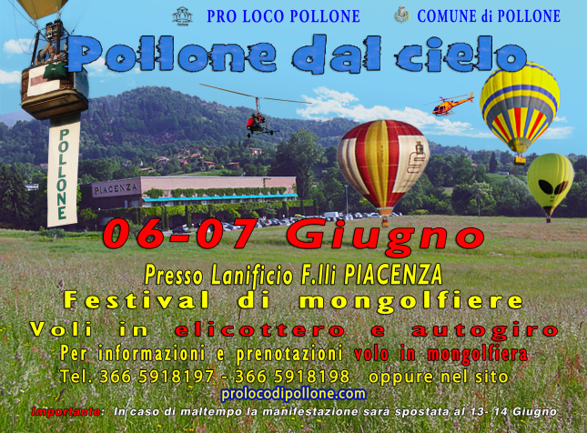 Programma: sabato ore 15 apertura della "Due giorni del basket", mongolfiera vincolata, Gruppo Arcieri Pollone, simulatore di volo, bolle di sapone giganti, aquiloni – ore 18 volo inaugurale delle mongolfiere – ore 19 cena con panissa – ore 21 discoteca; sarà possibile effettuar voli in mongolfiera. domenica ore 7 volo mongolfiere dal Santuario di Oropa, atterraggio a Pollone verso le ore 9.30 – ore 9 apertura mercatini – ore 10 voli in elicottero e poi aquiloni, bolle di sapone giganti, simulatore di volo, modellismo aereo e droni, Gruppo Arcieri Pollone, autogiro, animazione per i più piccoli – ore 12 pizza con forno a legna – ore 19 volo di chiusura delle mongolfiere; sarà possibile effettuare voli in elicottero e in mongolfiera. In caso di maltempo la manifestazione sarà rinviata al weekend successivo. dal 06 giugno 2015 al 07 giugno 2015 Pollone, area antistante il Lanificio F.lli Piacenza, regione CISI INFO Pro Loco Pollone Telefono: 366 5918197/198 www.prolocodipollone.com