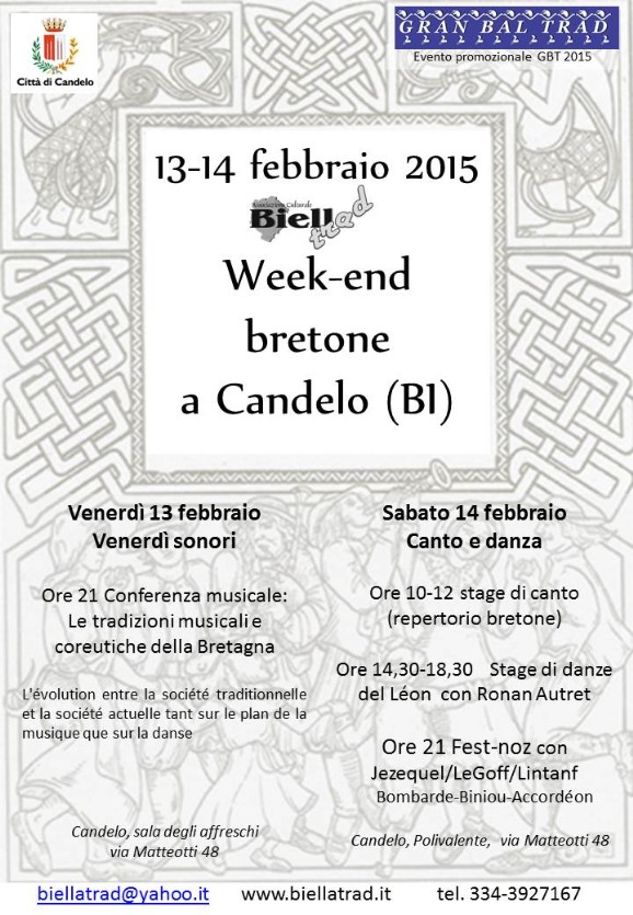 Primo appuntamento della rassegna "Venerdì sonori". Conferenza sulle tradizioni musicali e coreutiche della Bretagna " L'évolution entre la société traditionnelle et la société actuelle tant sur le plan de la musique que sur la danse". Verrà condotta in francese con traduzione/summa in italiano. Ingresso gratuito. INFO Biella Trad Telefono 334 3927167 www.biellatrad.it