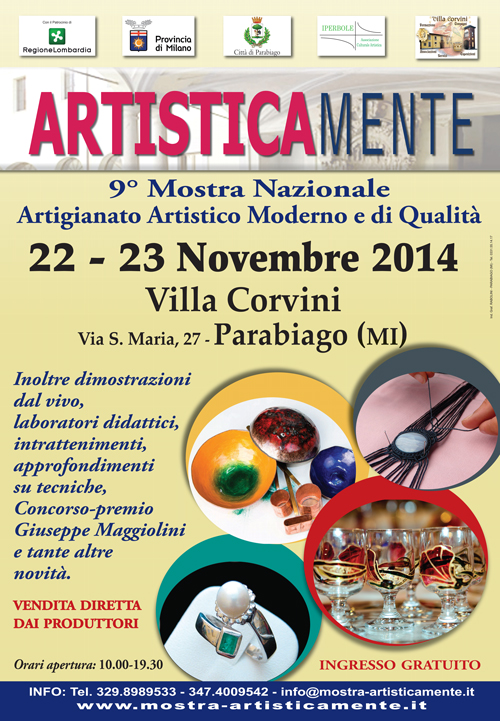 La mostra, promossa da Associazione culturale e artistica Iperbole per la difesa e valorizzazione dell’Artigianato Artistico, con l’organizzazione di Eventi doc di Myriam Vallegra ed in collaborazione con Centro Servizi Villa Corvini e Comune di Parabiago, è patrocinata da Regione Lombardia, Provincia di Milano, Comune di Parabiago. “Artisticamente”, evento ormai conosciuto nel settore dell’artigianato artistico e seguito con risultati di altissimo gradimento dal pubblico, ha lo scopo di promuovere, far conoscere e creare opportunità per l’artigianato artistico di qualità. Artisticamente, per la qualità della proposta, l’articolazione, l’allestimento, gli artigiani partecipanti e la location scelta, è stata pubblicata più volte, su diverse testate nazionali e ragionali, quali Il Corriere della Sera, ViviMilano, Milano Mese, Le idee di Casamia, Creare con Casaviva, Radio Lombardia, RAI televideo, RAI Yoyo, Il Giorno, Settegiorni, La Prealpina e portali e siti web … Ingresso gratuito al pubblico Vendita diretta dai produttori Dimostrazioni dal vivo Laboratori didattici Incontri con gli artigiani Approfondimenti su materiali e tecniche Orario di apertura al pubblico: 10.00 – 19.30 www.mostra-artisticamente.it