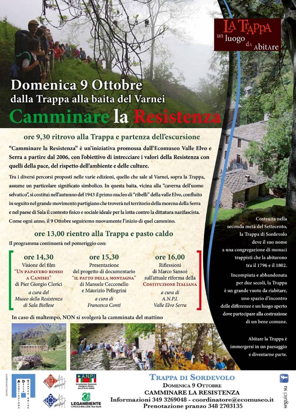 “Camminare la Resistenza” è un’iniziativa promossa dall’Ecomuseo Valle Elvo e Serra a partire dal 2006, con l’obiettivo di intrecciare i valori della Resistenza con quelli della pace, del rispetto dell’ambiente e delle culture. Tra i diversi percorsi proposti nelle varie edizioni, quello che sale al Varnei, sopra la Trappa, assume un particolare significato simbolico. In questa baita, vicina alla “caverna dell’uomo selvatico”, si costituì nell'autunno del 1943 il primo nucleo di “ribelli” della valle Elvo, confluito in seguito nel grande movimento partigiano che troverà nel territorio della morena della Serra e nel paese di Sala il contesto fisico e sociale ideale per la lotta contro la dittatura nazifascista. Il 9 Ottobre seguiremo nuovamente l’inizio di quel cammino. Dopo il ritorno alla Trappa e un pasto caldo, l'iniziativa proseguirà nel pomeriggio con tre momenti che collegheranno l’esperienza partigiana all’attualità - Programma dettagliato nella locandina sottostante In caso di maltempo non si svolgerà la camminata del mattino ma il programma del pomeriggio resterà invariato La partecipazione alle attività è libera – Per chi desidera pranzare alla Trappa occorre prenotare telefonando al 348 2703135 Come arrivare alla Trappa La Trappa si trova nel Comune di Sordevolo (BI) ed è raggiungibile attraverso due percorsi: - A piedi: arrivati a Sordevolo, lasciare l'auto in località Prera a monte del paese e salire lungo la strada fino al Pian dell'Asino, dove si prosegue seguendo la mulattiera (60 minuti - seguire le indicazioni) - In auto: arrivati al Santuario di Oropa, seguire la SP512 del Tracciolino fino al cartello Km 8 - Trappa, dove si lascia l'auto e si scende a piedi lungo la strada sterrata a sinistra (10 minuti - seguire le indicazioni) nel corso della giornata sarà presentata al pubblico il progetto del film Il Patto della Montagna una produzione Jean Vigo Italia, VideoAstolfoSullaLuna con il sostegno di MIBACT - Ministero Beni e Attività Culturali e Turismo e Film Commission Torino Piemonte vai al sito: www.ilpattodellamontagna.com vedi il trailer: https://vimeo.com/157791119 www.facebook.com/PattodellaMontagna