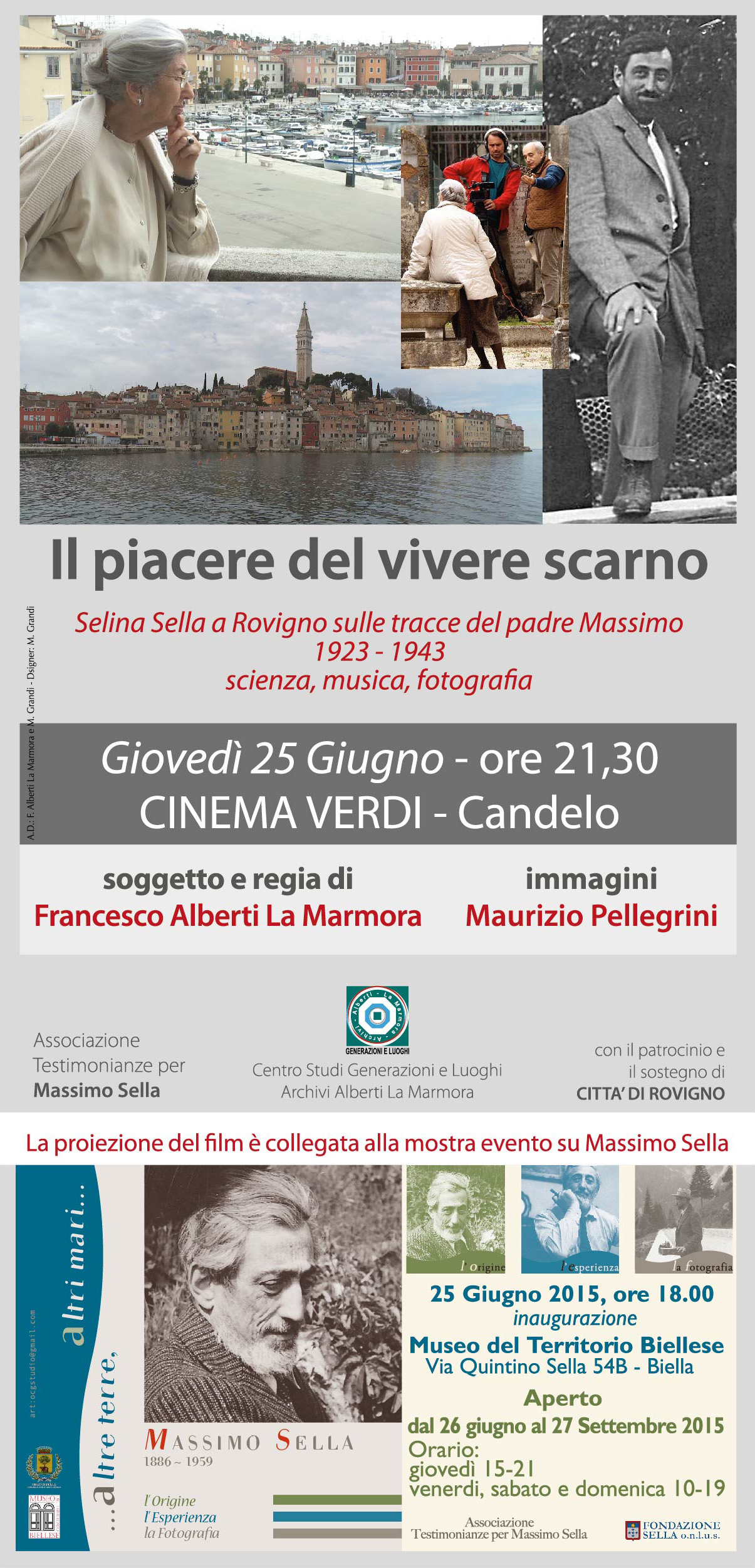 1923-1943 scienza, musica, fotografia. Una Produzione: Centro Studi Generazioni e Luoghi, VideoAstolfoSullaLuna Regia e soggetto: Francesco Alberti La Marmora Immagini: Maurizio Pellegrini - Suono: Gonzalo Bavestrello Montaggio: Francesco Alberti La Marmora, Maurizio Pellegrini Interpreti: Selina Sella Marsoni, Marino Budicin, Nenad Smoladka, Giovanni Radossi, Remigio Bosazzi, Adriano Alberti La Marmora Formato: HD (colore), 67’, 2014 Massimo Sella, discendente di una nota famiglia di industriali e banchieri, fu scienziato, musicista e fotografo. Nel 1923 fu nominato direttore dell'Istituto di Biologia Marina di Rovigno, nell'Istria ancora italiana, dove rimase fino al 1938. La figlia di Massimo, Selina, che a Rovigno visse fino all'età di quattordici anni, ritorna, dopo settant'anni sui luoghi della sua infanzia, scoprendo il grande contributo offerto dal padre alla comunità di Rovigno, attraverso la ricerca scientifica, la musica e un immenso patrimonio di fotografie che rappresentano il ritratto di un'epoca. La proiezione del film è collegata alla mostra-evento su Massimo Sella in programma al Museo del Territorio Biellese: Altre terre... altri mari, Massimo Sella, 1886-1959, l'Origine, l'Esperienza, la Fotografia dal 26 giugno al 27 settembre 2015 inaugurazione Giovedì 25 giugno, ore 18, Museo del Territorio Biellese
