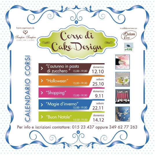 Prosegue il corso di CAKE DESIGN , organizzato da PASTICCERIA PAVESI E SEMPRESEMPRE EVENTI , in collaborazione con il centro commerciale GLI ORSI. Il prossimo appuntamento è fissato per DOMENICA 9 NOVEMBRE 2014 , dalle 15 alle 19 . Per iscriversi telefonate al numero 015 23437 o al 349 6277263.