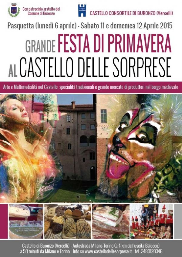 Una grande festa di primavera per tutta la famiglia: lunedì 6 Aprile (Pasquetta), sabato 11 e domenica 12 Aprile 2015 al Castello di Buronzo (Vercelli), a 50 minuti da Milano e Torino, ad appena 4 chilometri dall'Uscita di Balocco lungo l'autostrada Milano-Torino. Visita guidata di circa 40 minuti al Castello delle Sorprese (consigliata la prenotazione su www.castellodellesorprese.it), con una rappresentazione narrativa e multimediale, mercatini nel centro storico, aree coperte per pranzare (si potranno assaggiare anche la panissa vercellese e la pasta rustìa ossolana), cantastorie, giochi popolari. PROGRAMMA IL PROGRAMMA PUO' ESSERE EFFETTUATO DURANTE TUTTA LA GIORNATA, INDIFFERENTEMENTE DELL'ORARIO DI INGRESSO AL CASTELLO (prenotando la mattina si potranno fare le altre attività al pomeriggio, al contrario prenotando al pomeriggio o nel tardo pomeriggio si effettueranno prima le altre attività per concludere con la visita del Castello). Le attività previste sono le seguentI: - Visita guidata del Castello con l'installazione "La fata della Primavera e lo Spirito del Drago" - Intrattenimento con un vero cantastorie toscano "il Signore delle Ciliegie" - Area ed attività dedicate ai giochi di una volta e ai giochi di cortile (con 40 postazioni-gioco) - Laboratorio per bambini - Mercato di Primavera delle 4 province. Con il biglietto di ingresso al Castello verrà consegnato inoltre ad ogni bambino un "braccialetto amuleto" e un omaggio. Altri intrattenimenti non compresi nel prezzo del biglietto: - trenino turistico nel Borgo medievale - area gonfiabili per bambini - aree ristoro coperte Sarà possibile degustare anche piatti tipici locali come la panissa vercellese e la pasta rustìa ossolana. www.castellodellesorprese.it
