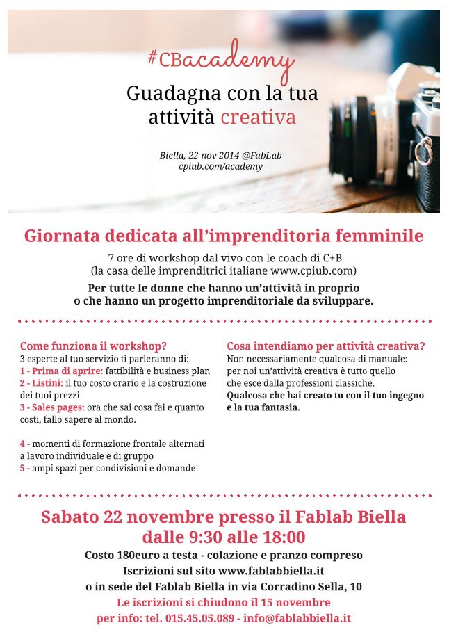 Per info e iscrizioni: www.fablabbiella.it Il corso si svolgerà negli spazi del FabLab Biella, il primo centro di sperimentazione si basa sulla “filosofia Fablab” (fabrication laboratory) presente nel Biellese. E' uno spazio in cui tutti posso progettare e realizzare i loro progetti esattamente come li hanno immaginati, senza vincoli o costrizioni, avendo a disposizione assistenza tecnica e macchinari di ultima generazione. E’ un luogo in cui la manualità si sposa con la tecnologia, dove le idee posso crescere e diventare qualcosa di concreto.