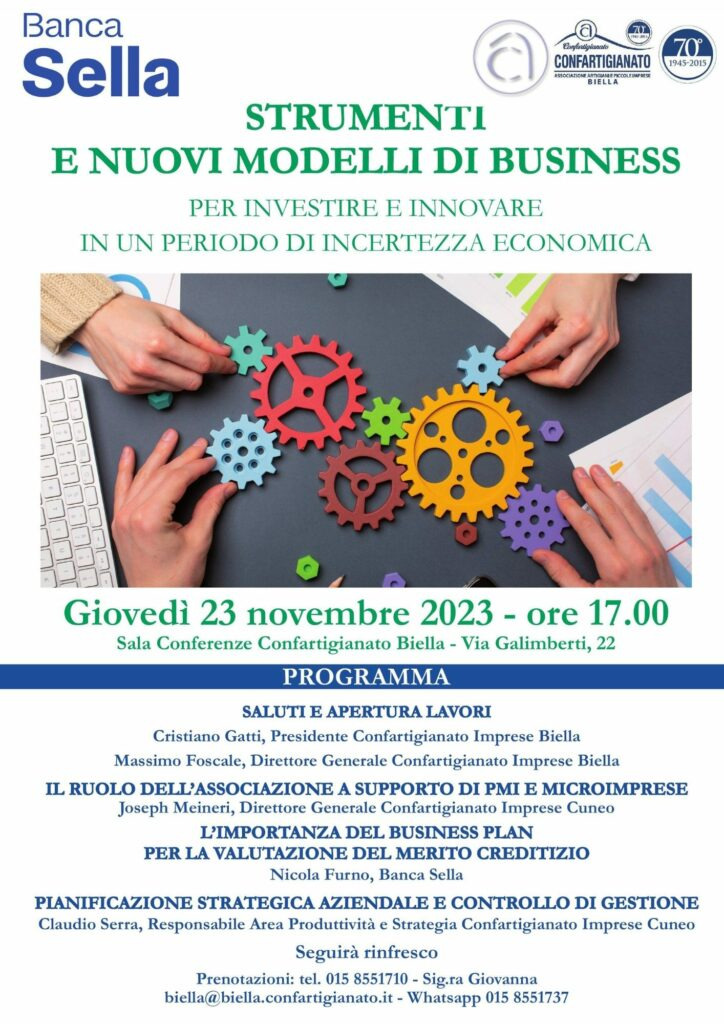 in un periodo storico caratterizzato da grandi cambiamenti economici, ma anche politici e sociali, per le imprese, specie quelle medio-piccole e artigiane, risulta fondamentale dotarsi degli strumenti giusti per approcciarsi in modo consapevole e preparato all’amministrazione d’impresa e relazionarsi con gli istituti bancari nelle varie fasi dell’accesso al credito. Questo le tematiche che verranno trattate il 23 novembre, alle ore 17, presso la sala conferenze di Confartigianato Biella nell’incontro organizzato in collaborazione con BANCA SELLA con lo scopo di illustrare agli imprenditori come “investire e innovare in un periodo di incertezza economica”. Ai saluti istituzionali del nostro presidente Cristiano Gatti e del nostro direttore Massimo Foscale seguiranno gli interventi di Joseph Maineri direttore di Confartigianato Cuneo, del Responsabile dell’Area Territoriale di Banca Sella Nicola Furno e del Responsabile dell’Area Produttività e Strategia di Confartigianato Claudio Serra, che delineeranno contesto di riferimento e metodologie di lavoro che le aziende devono adottare per pianificare nel breve, medio e lungo periodo la propria gestione d’impresa. Durante i lavori saranno anche presentati gli strumenti che Banca Sella mette a disposizione delle imprese del territorio.