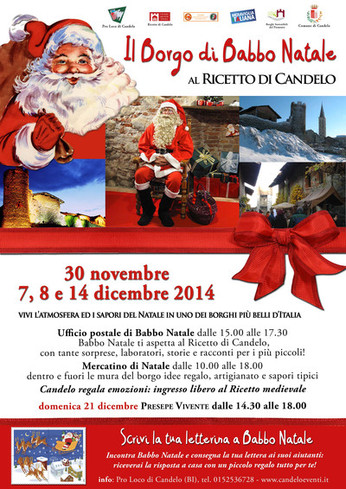 Animazioni e laboratori per bambini. Le botteghe degli artigiani e degli artisti del ricetto saranno aperte al turista per trovare il regalo d'autore che fa al caso vostro. Ore 14.30 per i più piccini apertura dell'Ufficio postale di Babbo Natale, che vi aspetta a braccia aperte per ricevere le vostre letterine! I bambini verranno accolti da Babbo Natale in persona. Laboratori didattici, musica e animazione. Ore 18 chiusura.