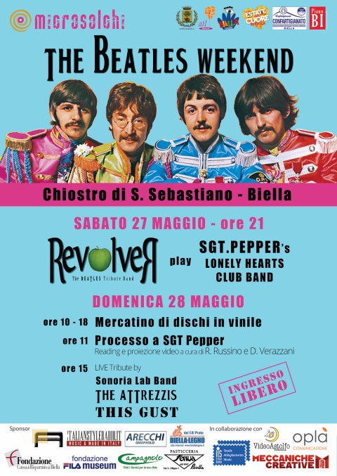 SABATO 27 MAGGIO ORE 21 REVOLVER play “Sgt. Pepper’s Lonely Hearts Club Band” una delle migliori Beatles Tribute Band eseguirà l'intero l’album Sgt Pepper’s Lonely Hearts Club Band accompagnata da una piccola orchestra in grado di ricreare le stesse sonorità del disco, un monumento della musica rock che celebra i 50 anni. Finale a sorpresa con gli attori di Ars Teatrando. ____________________________ DOMENICA 28 MAGGIO ORE 10-18 MOSTRA-MERCATO DI DISCHI IN VINILE ORE 10-13 DJ set vinilico a cura di PETER DJ ORE 11 Processo a SGT. PEPPER a cura di Riccardo Russino e Davide Verazzani due scrittori si cimentano in un racconto per parole, musica e immagini del più celebre disco dei Beatles. ORE 15.30 SONORIA LAB BAND una selezione di brani solisti dei 4 di Liverpoool a cura degli allievi della Scuola di Musica Sonoria di Cossato (BI). ORE 16 THE ATTREZZIS i Beatles rivisitati in italiano e con tanta ironia da una band tutta biellese ORE 17.30 THIS GUST play The BEATLES una cover band biellese in un repertorio tutto dedicato ai Fab Four. ____________________________ microsolchi è una manifestazione organizzata da: Associazione Piano BI Città di Biella ATL Biellese con il contributo di: Fondazione FILA Museum Fondazione Cassa di Risparmio di Biella Autoattiva Italian Style Radio Carrozzeria Campagnolo Pasticceria Ferrua Biella Legno in collaborazione con IIS "Q. Sella" - Tessile Abbigliamento Moda - Biella Confartigianato Biella Scuola di Musica - Sonoria - Cossato (BI) ARS Teatrando - Biella VideoAstolfoSullaLuna Oplà Comunicazione Meccaniche Creative info@microsolchi.it facebook: @microsolchibiella In occasione di questa manifestazione la nostra associazione organizzerà una sfilata di moda.