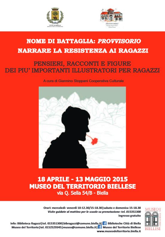 La mostra dal titolo “NOME DI BATTAGLIA: PROVVISORIO. NARRARE LA RESISTENZA AI RAGAZZI. PENSIERI, RACCONTI E FIGURE”, promossa e organizzata dall’Assessorato alla Cultura-Biblioteca Ragazzi, con un percorso a cura della cooperativa culturale Giannino Stoppani di Bologna con la collaborazione della Biblioteca Ragazzi, in occasione del 70° anniversario della LIBERAZIONE. La mostra proseguirà fino al prossimo 13 maggio. ORARI: Mer-gio-ven 10-12.30 / 15-18.30, Sab e dom 15-18.30. VISITE GUIDATE AL MATTINO PER SCOLARESCHE PRENOTANDO ALLO 015.351300