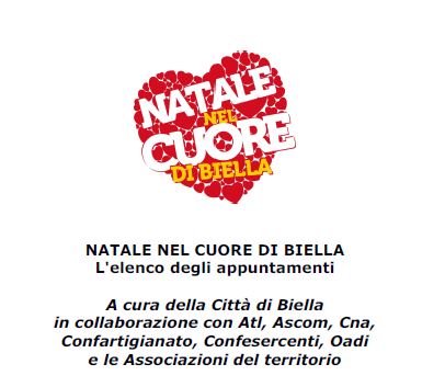 NATALE NEL CUORE DI BIELLA L'elenco degli appuntamenti A cura della Città di Biella in collaborazione con Atl, Ascom, Cna, Confartigianato, Confesercenti, Oadi e le Associazioni del territorio Da sabato 29 novembre Natale in giostra mini luna park per bambini dalle 10 alle 12 e dalle 16 alle 22, piazza Duomo Domenica 30 novembre Aperimoda sfilata di moda ore 16,30, via Gustavo di Valdengo a cura di ASCOM Biella, OADI e Glamour Lounge & Restaurant Venerdì 5 dicembre Apertura dell’esposizione: “Adorazione dei pastori” di Bernardino Lanino, di proprietà del Santuario di Oropa. Ore 18, Museo del Territorio L’esposizione resterà aperta dal 6 dicembre all’11 gennaio nei seguenti orari: mercoledì –venerdì 10-12.30 / 15-18.30 sabato e domenica 15-18.30 Da sabato 6 dicembre al 7 gennaio Biella on Ice pista di pattinaggio Feriali 16-18. Festivi e pre-festivi 10,30-12,30/16,00-18,00. Serali per eventi 18,30–20,30 - piazza Mons. Rossi (Battistero) Da sabato 6 dicembre Concorso fotografico selfie in vetrina tutta la città a cura di Confesercenti Sabato 6 dicembre Concerto di violino, violoncello e pianoforte a cura dell’Istituto Musicale Ermellino Allorto ore 21, Chiesa di S. Giacomo Biella Piazzo a cura dell’assessorato alla Cultura Comune di Biella Domenica 7 dicembre Mercato al Centro piazza Vittorio Veneto - viale Matteotti a cura dell’assessorato Attività economiche e produttive Domenica 7 dicembre Mercatino di Natale portici di piazza Vittorio Veneto e viale Matteotti a cura degli Hobbisti Biellesi Domenica 7 dicembre Spettacolo musicale itinerante con I Marciapé dalle 14,30, via Italia a cura di ASCOM Biella e OADI Domenica 7 dicembre Banca del Giocattolo dalle 14,30 alle 18, Piazza Giovanni Bosco Domenica 7 dicembre Broadway Dance spettacolo di danza classica e moderna Ore 15, piazza S. Marta a cura di ASCOM Biella e OADI Lunedì 8 dicembre Cavalli in città passeggiata in carrozza dalle ore 15, piazza S. Marta a cura di ASCOM Biella e OADI Lunedì 8 dicembre Battesimo della sella pony per i più piccini dalle ore 15, piazza S. Marta a cura di ASCOM Biella e OADI Lunedì 8 dicembre Concerto della Banda Verdi in occasione dell’apertura delle celebrazioni del cinquecentenario della nascita di S. Filippo Neri ore 21, Chiesa S. Filippo a cura dell’assessorato alla Cultura Comune di Biella Martedì 9 dicembre Presentazione libro di Enrica Mossone sull’Orfanotrofio di Biella ore 18, Sala Conferenze Museo del Territorio a cura dell’assessorato alla Cultura Comune di Biella Mercoledì 10 dicembre Presentazione libro di Angelica Sella “Vittorio Sella - Mountain Photographs 1879-1909” ore 18, Sala Conferenze Museo del Territorio a cura dell’assessorato alla Cultura Comune di Biella Giovedì 11 dicembre Nu season gospel tour – concerto Gospel a cura del Sunshine Gospel Choir ore 20,30, Teatro Sociale Villani a cura dell’assessorato alla Cultura Comune di Biella e Associazione Il Contato del Canavese Sabato 13 dicembre Basket in centro Piazza Fiume Organizzato dal gruppo minibasket di Pallacanestro Biella a cura di Confesercenti Sabato 13 dicembre Fiera del gusto Piazza San Giovanni Bosco Sabato 13 dicembre L'AltroNatale mercatino solidale delle associazioni di volontariato dalle 9, via Italia portici di palazzo Oropa a cura dell’Associazione Amici Biellesi Famiglie senza frontiere onlus Sabato 13 dicembre Presentazione libro su Fulvio Platinetti ore 17, Sala Conferenze Museo del Territorio a cura dell’assessorato Cultura Comune di Biella Sabato 13 dicembre Concerto “Santa Lucia, Avvento in cammino” delle Cantorie di Andorno e Sagliano Micca ore 21, Chiesa di S. Giacomo Biella Piazzo a cura della Pro Loco di Biella e Valle Oropa Domenica 14 dicembre Mercato al Centro Piazza Vittorio Veneto e viale Matteotti a cura dell’assessorato Attività economiche e produttive Domenica 14 dicembre Mercatino di Natale Portici di piazza Vittorio Veneto e viale Matteotti a cura degli Hobbisti Biellesi Domenica 14 dicembre Cavalli in città passeggiata in carrozza Piazza Santa Marta Domenica 14 dicembre Battesimo della sella pony per i più piccini Piazza Santa Marta Domenica 14 dicembre Sapori & Saperi mostra mercato dell'enogastronomia e dell'artigianato biellese d’eccellenza dalle 10 alle 18, piazza Cisterna Borgo Piazzo a cura dell’assessorato Attività economiche e produttive e ATL Domenica 14 dicembre Esibizione delle “Lucie di Enköping” ore 11,30, piazza Cisterna a cura dell’assessorato Cultura Comune di Biella e Pro Loco di Ronco Biellese Domenica 14 dicembre Spettacolo musicale itinerante con la Fantomatik Orchestra dalle 15 alle 18, via Italia e Biella Piazzo a cura dell’assessorato Cultura Comune di Biella Domenica 14 dicembre Spettacolo di musica classica ore 15, Via Italia portici di Palazzo Oropa a cura dell’Associazione musicale Sonoria Lunedì 15 e martedì 16 dicembre Posta di Babbo Natale con annullo postale dalle 10 alle 18, via Mazzini, 1 a cura di ASCOM Biella e OADI Venerdì 19 dicembre Concerto del tenore Alejandro Escobar ore 21, Chiesa di S. Cassiano a cura dell’assessorato alla Cultura Comune di Biella Venerdì 19 dicembre Concerto di Natale della “Banda Verdi Città di Biella” con la partecipazione della Società La Marmora Biella ore 20.30, Palazzetto dello Sport via Pajetta, 49 a cura dell’assessorato alle Politiche Sociali Comune di Biella Domenica 21 dicembre Mercato al Centro Piazza Vittorio Veneto - viale Matteotti a cura dell’assessorato Attività economiche e produttive Domenica 21 dicembre Mercatino di Natale a cura degli Hobbisti Biellesi Portici di piazza Vittorio Veneto e viale Matteotti Domenica 21 dicembre Concerto di Natale con il Biella Gospel Choir ore 16, Chiesa Santissima Trinità a cura dell’assessorato alla Cultura Comune di Biella Domenica 21 dicembre New Orleans a Biella musica jazz ore 15, Piazza S. Marta a cura di ASCOM Biella e OADI Domenica 21 dicembre Spettacolo musicale itinerante co