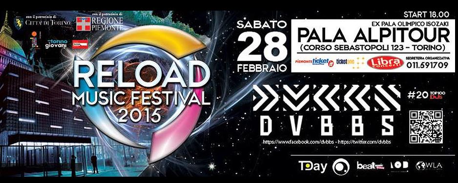 Il Reload Music Festival, firma la sua prima edizione sabato 28 febbraio 2015 al Pala Alpitour di Torino, realizzando l’unica data italiana del duo DVBBS, fra i primi 20 nella classifica mondiale della TOP 100DJ MAG.L’esclusiva collaborazione tra il Reload Music Festival e i DVBBS richiamerà l’attenzione di giovani da tutta Italia che assisteranno ad uno spettacolo unico per scenografia e sound rendendo questo appuntamento memorabile per i followers della musica dance/EDM. La location è la più esclusiva e storica della Città di Torino sede dei più importanti concerti italiani: PALA ALPITOUR (Ex Pala Olimpico Isozaki) Corso Sebastopoli 123 – TORINO I biglietti posso essere acquistati sui circuiti online Ticket One & Piemonte Ticket