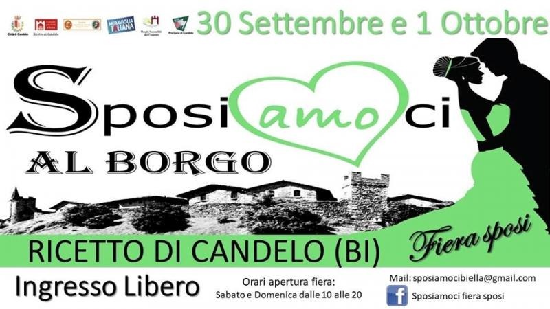 La fiera sposi Sposiamoci al borgo si terrà all'interno del borgo medievale di Candelo ed è una manifestazione unica nel suo genere che punta attraverso l’inusuale location a mostrare molti professionisti nel settore wedding di Biella e province limitrofe con l'intento di proporre ai visitatori un'ampia scelta. Inoltre il primo giorno dell'evento alle 18 ci sarà una sfilata di abiti sposi e all'interno del ricetto avrete la possibilità di gustarvi un cocktail e stuzzicare qualcosa. Una volta entrati in questa magica atmosfera vi aspetta un percorso itinerante attraverso le famose “rue” per arrivare all’ultima, dove partecipando ad un concorso si potrà vincere un fantastico premio. Alla fiera saranno presenti 50 espositori provenienti dalle province di Biella, Vercelli, Ivrea, Novara e Torino.