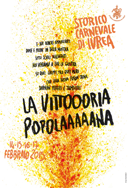 Domenica 15 febbraio 2015 Domenica di Carnevale ore 09.00 Fagiolate Distribuzione dei fagioli grassi presso le Fagiolate del Castellazzo (piazza Maretta), San Lorenzo (Ex Polveriera), via Dora Baltea e San Bernardo (piazza della Chiesa). ore 09.30 Giuramento di Fedeltà del Magnifico Podestà in piazza Castello. Il Podestà con il suo seguito ed i Credendari, salendo per via della Cattedrale, si recano in piazza Castello per effettuare davanti all’antica sede del Comune il giuramento di fedeltà agli Statuti alla presenza del Corteo Storico. ore 10.00 Visita della Mugnaia e del Generale alla Fagiolata Benefica del Castellazzo in piazza Maretta. Generale, Mugnaia ed il loro seguito fanno visita alla fagiolata per il rituale assaggio dei fagioli e per l’inizio della distribuzione delle razioni benefiche. Il Podestà al Castellazzo scalza la pietra per la Preda in Dora dai ruderi del Castellazzo con l’antico martello d’arme. ore 10.30 Preda in Dora sul Ponte Vecchio Il Podestà con il suo seguito ed i Credendari, accompagnato dagli Alfieri e dai Pifferi e Tamburi, volgendo le spalle al parapetto del ponte getta dietro di sé verso valle la pietra tratta dal Castellazzo pronunciando la frase “Hoc facimus in spretum olim Marchionis Montisferrati, nec permittemus aliquod aedificium fieri ubi erant turres domini Marchionis” (facciamo questo in dispregio del Marchese del Monferrato, né permetteremo che alcun edificio abbia a sorgere dove erano le torri del signor Marchese) in segno di rifiuto di ogni forma di tirannia. La Mugnaia con il Generale, lo Stato Maggiore e la Scorta d’Onore assistono alla Cerimonia dalla sponda destra del fiume. ore 13.00 Inquadramento dei Carri da getto in corso M. d’Azeglio per verifiche e controlli. Vengono controllati, dal veterinario della Fondazione, tutti i cavalli sia a livello documentazione che stato fisico, compresa la correttezza delle ferrature agli arti. I controlli passano ai carri che devono avere in regola la documentazione di “bordo” (collaudo statico carro, brevetti conducenti, documenti cavalli per ASL) ed anche alcune corrispondenze al regolamento (sicurezza e misure del carro, maschere di protezione aranceri). Ultimo, non certo a livello di importanza, l’alcool test eseguito su tutti i conducenti da parte delle Autorità di Pubblica Sicurezza competenti. Dopo tutte le verifiche i carri vengono distribuiti nelle varie piazze di tiro in attesa dell’inizio della battaglia. ore 14.00 Inizio della Marcia del Corteo Storico da piazza di Città Gli Alfieri con le Bandiere dei Rioni, i Pifferi e Tamburi, il Generale con lo Stato Maggiore, il Sostituto e gli Abbà a cavallo; la Banda Musicale, la Mugnaia con le Damigelle sul cocchio dorato trainato da tre cavalli bianchi; la Scorta d’Onore della Mugnaia; i Paggi a cavallo, il Mugnaio (Toniotto) sul carro dei rifornimenti, il Podestà sul carro con i Credendari a cavallo percorrono il corso di gala: piazza di Città, via Arduino, piazza Gioberti, via Guarnotta, Ponte Vecchio, via Gozzano, piazza Lamarmora, corso Nigra, corso Cavour, corso Re Umberto, corso Gallo, corso Botta, piazza Balla, corso Massimo d’Azeglio, via IV° Reggimento Alpini (Ufficio del Turismo), via Cascinette, corso Massimo d’Azeglio, piazza Balla, via Palestro, piazza di Città Battaglia delle arance Le nove Squadre a piedi danno vita alla Battaglia delle arance con i tiratori sulle Pariglie e sui Tiri a quattro suddivisi su due percorsi: interno (piazza Ottinetti e piazza di Città) ed esterno (Borghetto, piazza del Rondolino passando da Lungo Dora e piazza Freguglia). ore 17.30 Generala in piazza Città. Al termine del giro iPifferi e Tamburi eseguono la Generala in onore del Generale. ore 21.30 Spettacolo pirotecnico e gran festa sul Lungo Dora in onore della Vezzosa Mugnaia