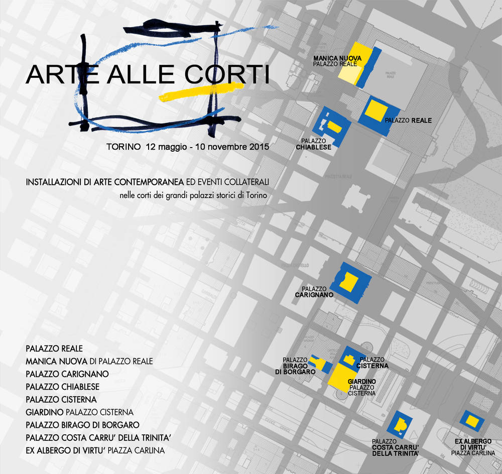 La mostra nelle corti dei grandi palazzi storici torinesi ha l’obiettivo di far scoprire al grande pubblico aspetti meno conosciuti del centro storico della città, facendo dialogare attraverso un’interazione culturalmente ed esteticamente stimolante la bellezza dell’architettura barocca torinese e l’arte attuale. In varie sedi, dal 30 giugno al 10 novembre. Ubicazione opere: PALAZZO SALUZZO PAESANA LUNEDÌ - VENERDÌ 8.00 - 12.30 / 15.00 - 19.00; SABATO 8.00 - 11.00 / D0MENICA CHIUSO PALAZZO CIVICO LUNEDÌ - SABATO 8.00 - 19.00 ; D0MENICA CHIUSO PALAZZO CHIABLESE LUNEDÌ - VENERDÌ 10.00 - 18.30; SABATO E D0MENICA CHIUSO PALAZZO REALE MARTEDÌ - DOMENICA 9.00 - 19.00; LUNEDÌ CHIUSO GIARDINI REALI MARTEDÌ - DOMENICA 9.00 - 19.00; LUNEDÌ CHIUSO PALAZZO DELL’UNIVERSITÀ DEGLI STUDI, GIÀ REGIA UNIVERSITÀ LUNEDÌ - VENERDÌ 10.00 - 19.00; SABATO E DOMENICA CHIUSO PALAZZO CARIGNANO TUTTI I GIORNI 10.00 - 18.30 PALAZZO ASINARI DI SAN MARZANO TUTTI I GIORNI 10.00 - 13.00 / 14:30 - 17.00 PALAZZO CISTERNA LUNEDÌ - VENERDÌ 10.00 - 19.00; SABATO E DOMENICA CHIUSO GIARDINO PALAZZO CISTERNA TUTTI I GIORNI 10.00 - 19.00 PALAZZO BIRAGO DI BORGARO LUNEDÌ - VENERDÌ 09.00 - 17.00; SABATO E DOMENICA CHIUSO www.arteallecorti.it