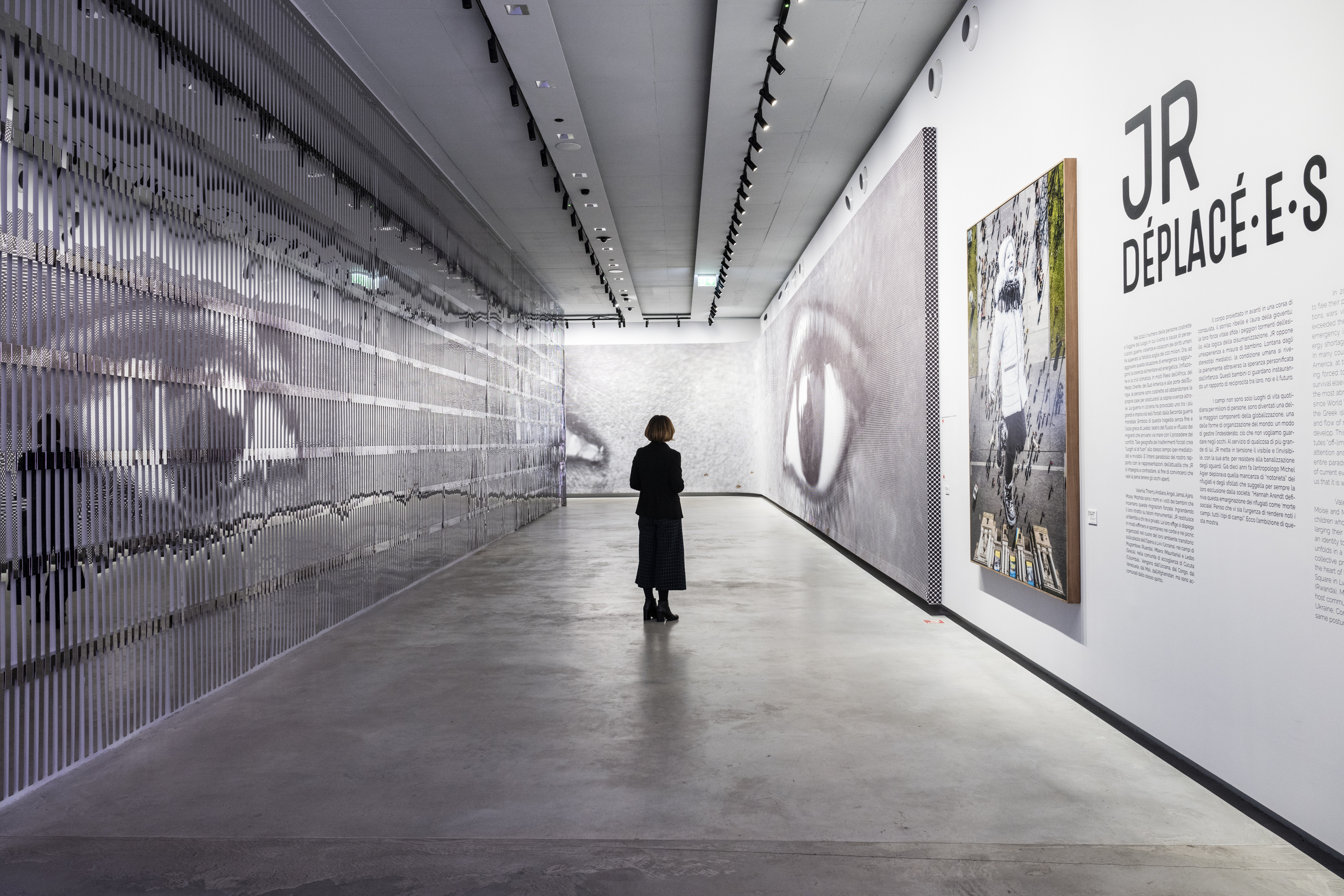 I problemi dei migranti e dei rifugiati, sempre più di scottante attualità, fanno da molto tempo parte dell’indagine di JR. Con il progetto Déplacé∙e∙s, cominciato nel 2022 e presentato per la prima volta in questa mostra, l’artista ha viaggiato in zone di crisi, dall’Ucraina sconvolta dalla guerra fino agli sterminati campi profughi di Mugombwa, in Rwanda, e di Mbera, in Mauritania, Cùcuta in Colombia e a Lesbo, in Grecia per riflettere sulle difficili condizioni in cui oggi versano migliaia di persone a causa di conflitti, guerre, carestie, cambiamenti climatici e coinvolgere pubblici esclusi dal circuito artistico e culturale all’insegna di valori come libertà, immaginazione, creatività e partecipazione.