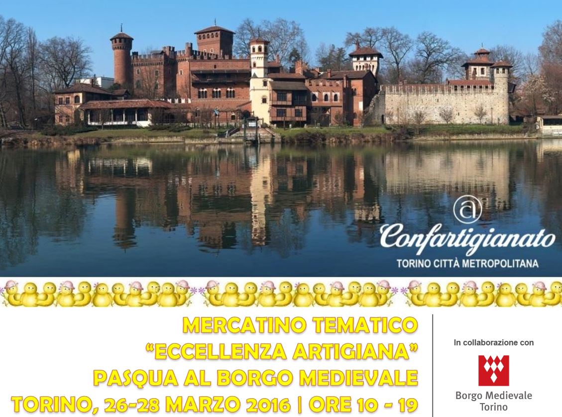 Sabato 26 - Domenica 27 – Lunedì 28 marzo 2016, orario 10,00-19,00. Borgo Medievale Torino - Parco del Valentino, 10126 Torino Il mercatino è dedicato alla valorizzazione delle produzioni artigianali locali e della manifattura Made in Italy. In vista della ricorrenza di Pasqua, Confartigianato e gli espositori vi attenderanno al Borgo Medievale; un’interessante opportunità per lo shopping rivolta al pubblico torinese e ai turisti con la possibilità di ammirare e di acquistare direttamente dagli artigiani prodotti di eccellenza: dall’alimentare alla moda-accessori e al settore artistico. www.confartigianatotorino.it